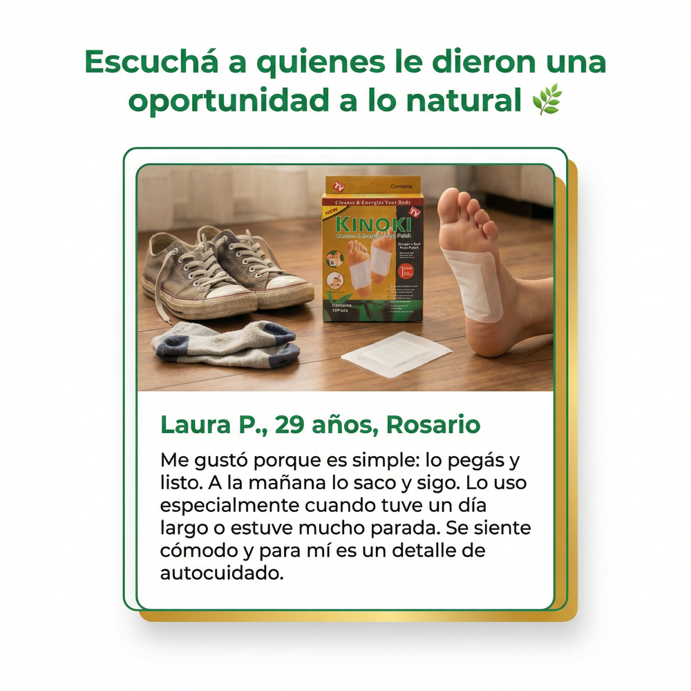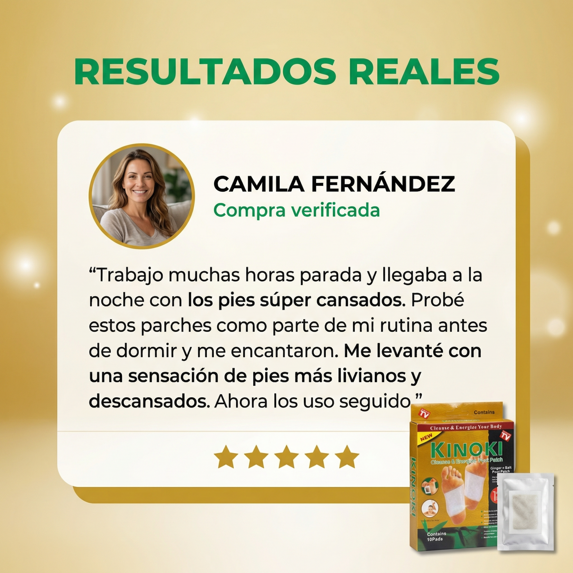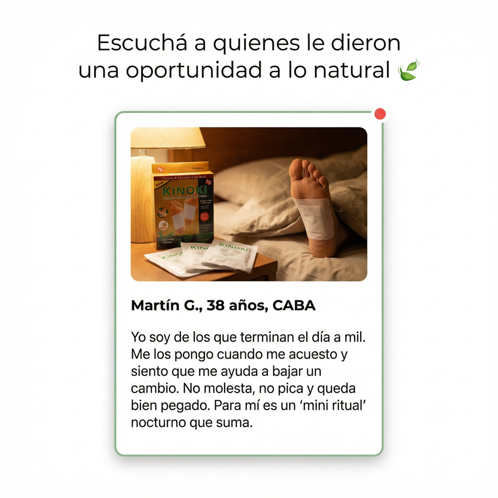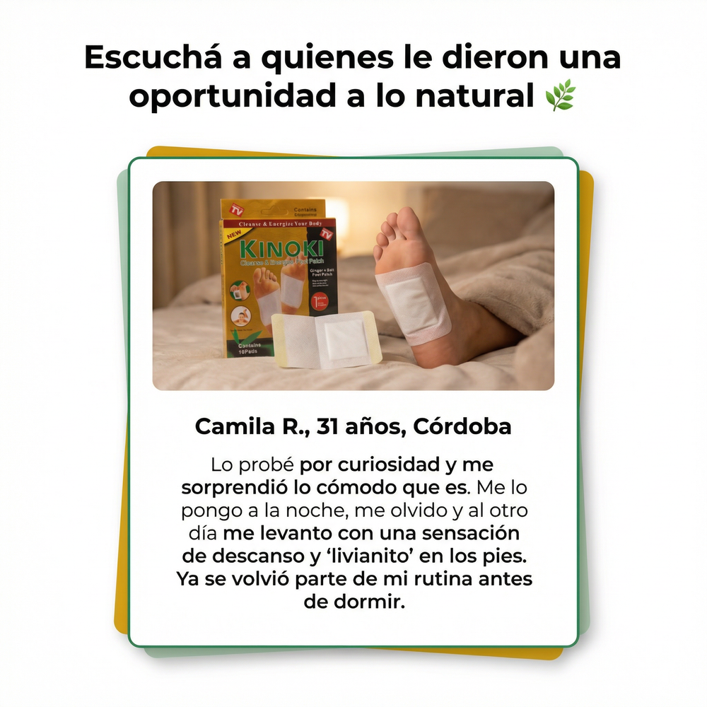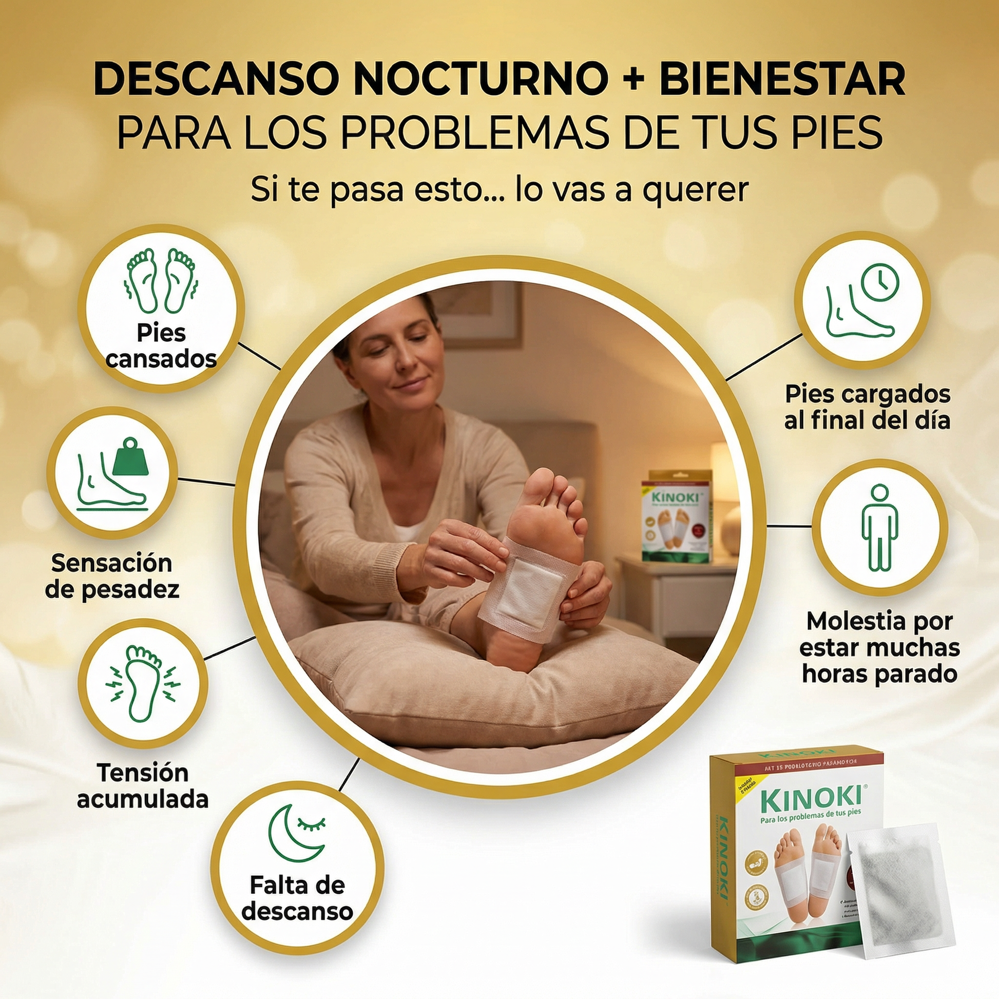 Te ponés tu parche Kinoki en los pies antes de dormir… y al despertar sentís el cuerpo más liviano, como si hubieras descansado en serio.