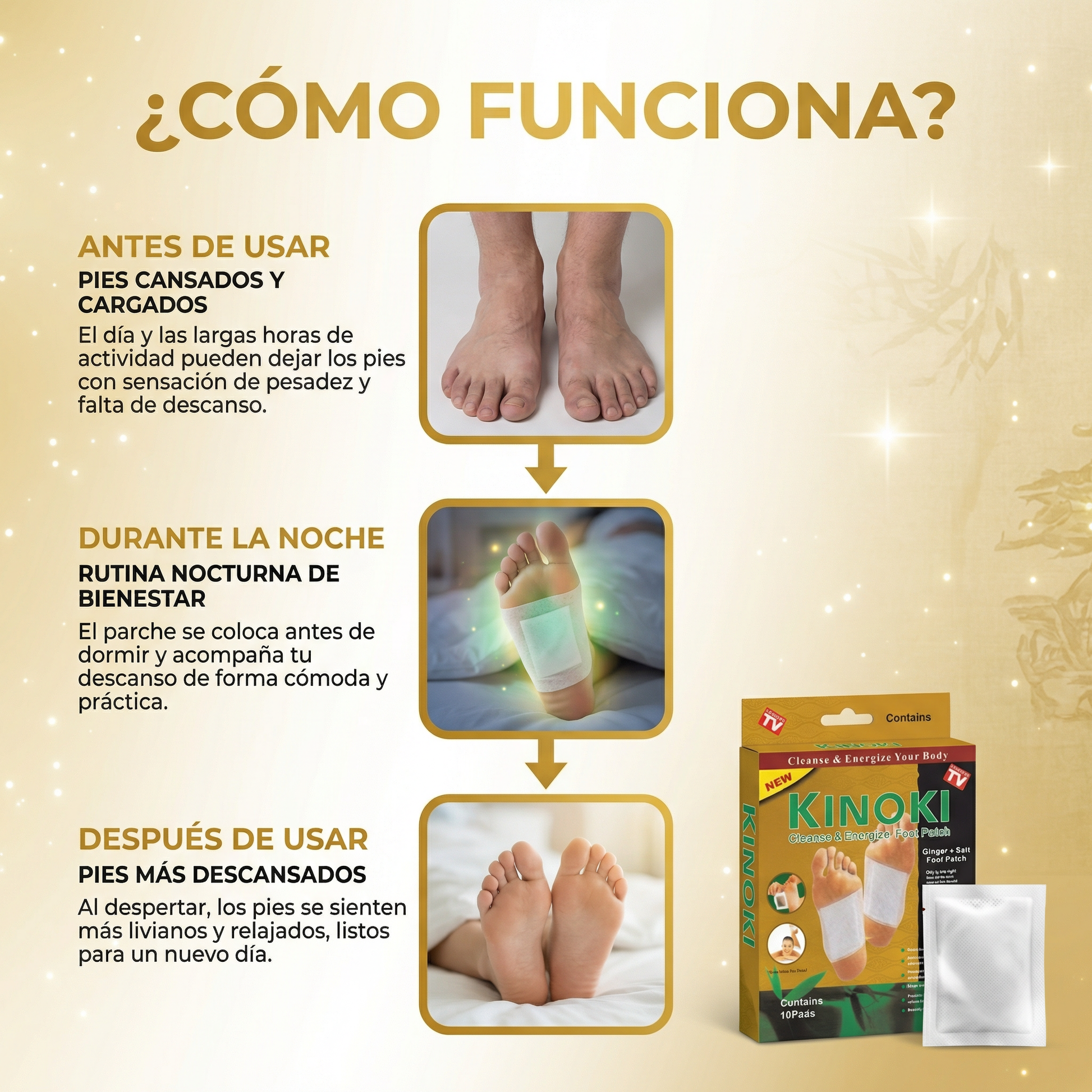 KINOKI es un parche nocturno diseñado para acompañar el proceso natural de descanso del cuerpo mientras dormís. Se coloca en la planta de los pies antes de acostarte y actúa durante la noche, ayudando a brindar una sensación de alivio, liviandad y bienestar general al despertar.